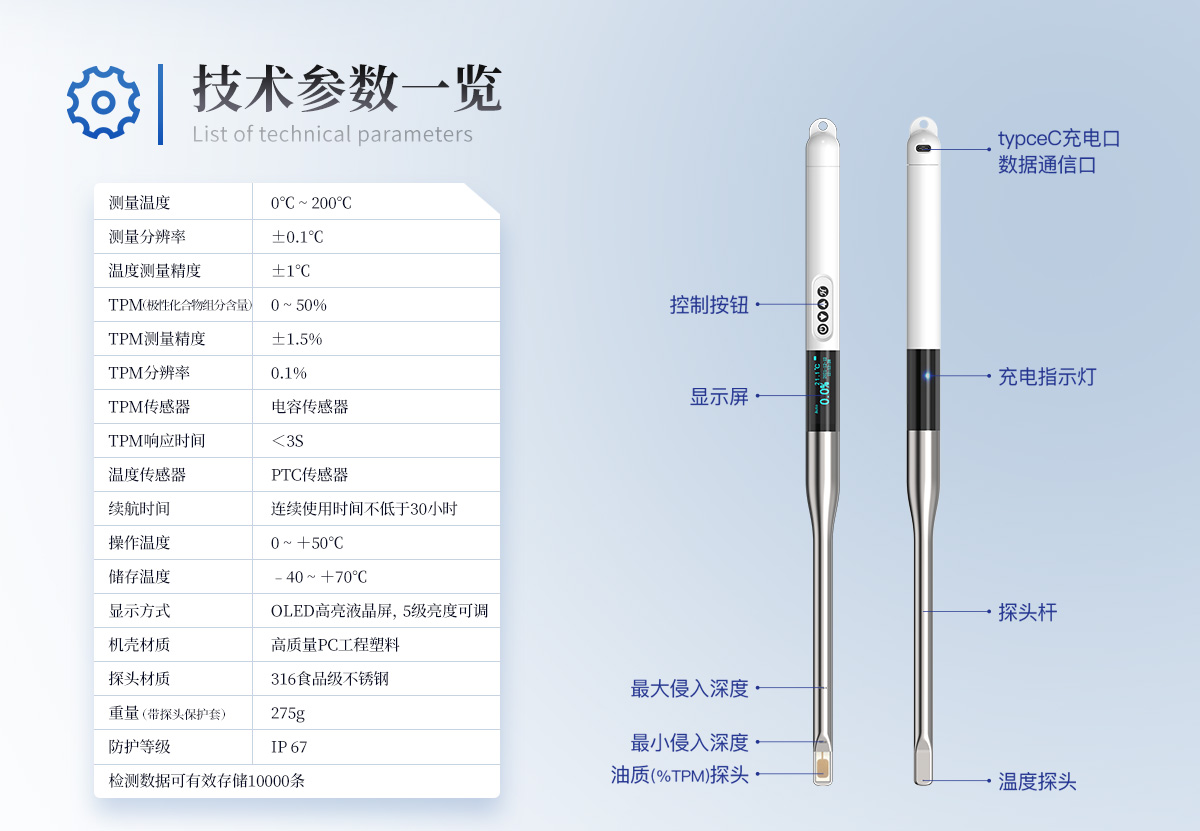 食用油脂是人們攝取能量和營(yíng)養(yǎng)的重要來(lái)源,是加工食品的重要原料。油炸食品以其特有風(fēng)味廣受消費(fèi)者喜歡。用于煎炸的食用油在高溫煎炸過(guò)程中發(fā)生一系列的物理、化學(xué)變化,這些變化會(huì)生成對(duì)身體健康有害的物質(zhì)。目前,煎炸食用油的傳統(tǒng)檢測(cè)方法多為化學(xué)方法,這些方法必須在實(shí)驗(yàn)室內(nèi)由專業(yè)人員操作,費(fèi)時(shí)費(fèi)力,化學(xué)試劑的使用可能會(huì)傷害檢測(cè)人員健康,且化學(xué)廢劑污染了環(huán)境。YT-SYP是一種快速,安全,**食用油品質(zhì)檢測(cè)儀,能夠快速檢測(cè)食用油中的極性化合物組分含量。本產(chǎn)品能夠在油溫較高的環(huán)境下使用,適用于各種煎炸的食用油品質(zhì)檢驗(yàn)。