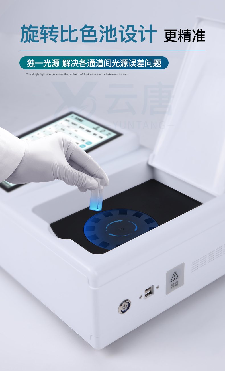 5)光源:進口高精四波長冷光源,每個通道均配置 410、520、590、630nm 波長光源,設備具備開機自動校準及一鍵校準功能,確保檢測數據結果準確。